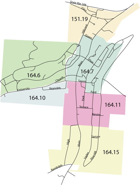 The village of Alfred is divided up into six major tracts, shown in the map above. Your tax bill probably lists your property using a number which begins with one of those shown. By either using your tax bill, or your knowledge of geography, click on the appropriate tract to go to another map which will permit you to get information about individual parcels.